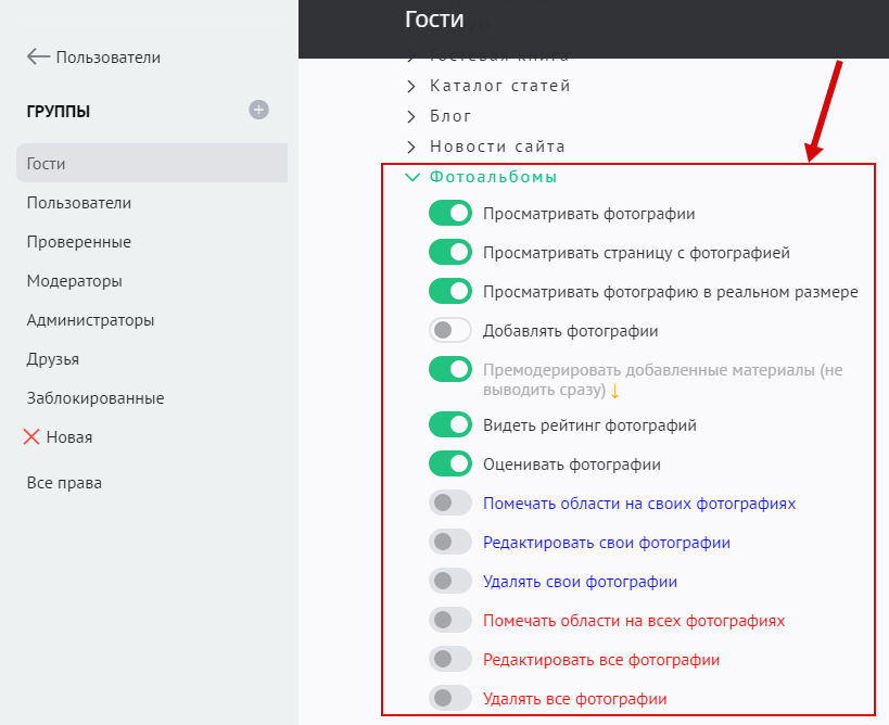 Выберите подходящую группу и в списке прав найдите раздел «Фотоальбомы»: