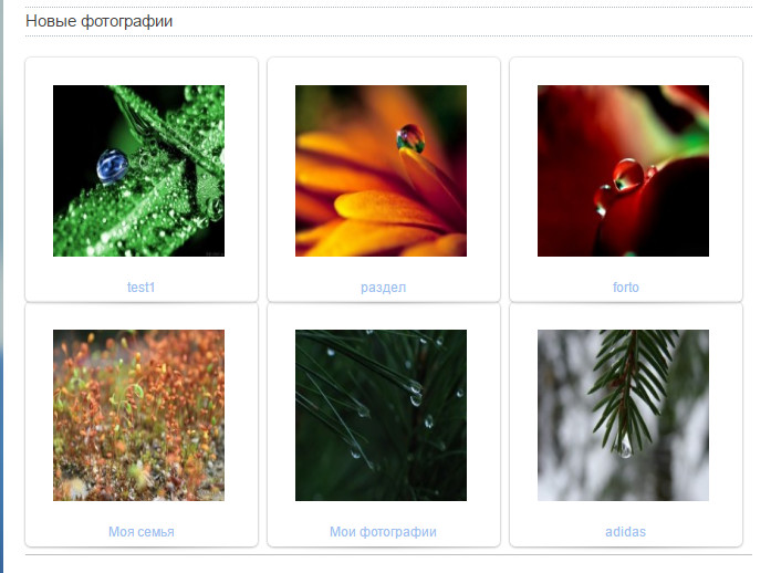 В итоге на главной странице модуля “Фотоальбомы” будут отображаться превью последних добавленных фотографий в категориях. Внизу превью выводится название категории.