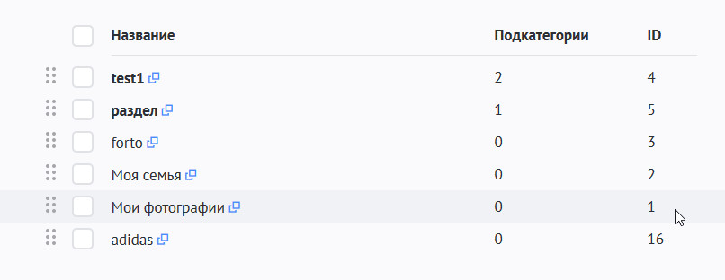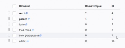 • ID раздела, категории которого необходимо вывести. Поле нужно заполнять только в том случае, когда вам нужно выводить на главную только избранные категории. В поле через запятую нужно проставить номера ID категорий. ID разделов вы можете получить на странице категорий фотоальбома.