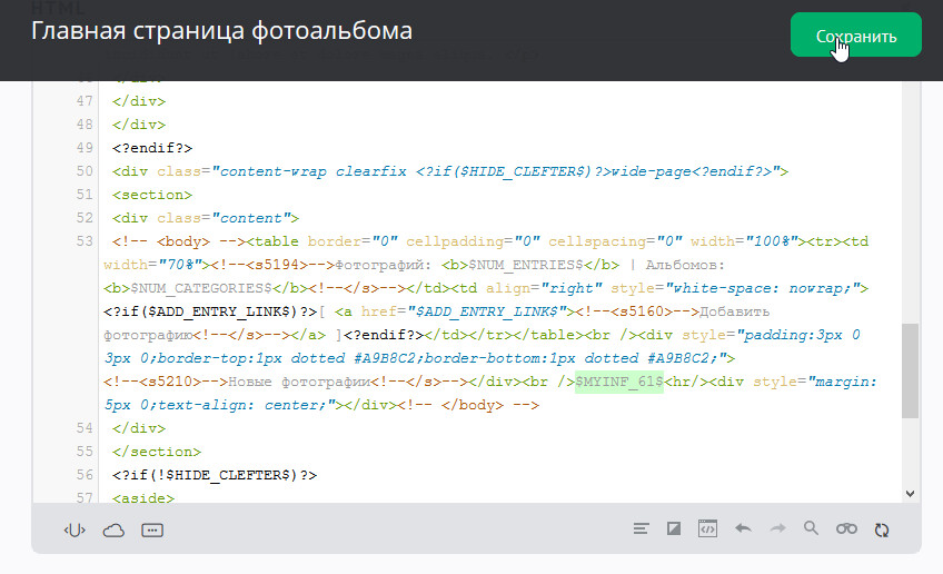 Далее найдите код $BODY$ и замените его кодом информера, который вы скопировали при создании информера $MYINF_х$ (вместо х у вас будет свое число). Как только замените $BODY$ на код информера, можете сохранять шаблон.