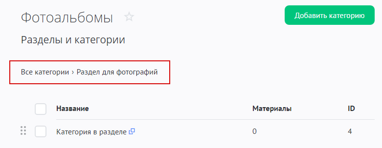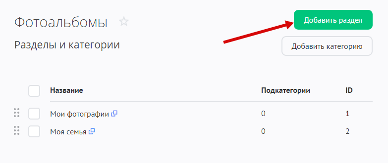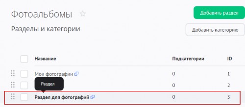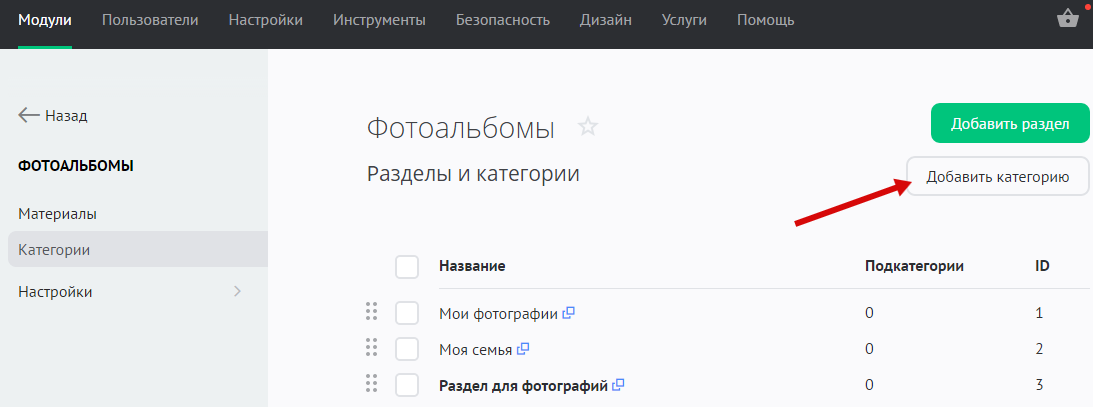 На странице «Модули» / «Фотоальбомы» / «Категории» нажмите на кнопку «Добавить раздел»: