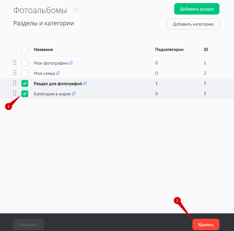 Для удаления категории или раздела отметьте их в списке и нажмите на кнопку «Удалить»: