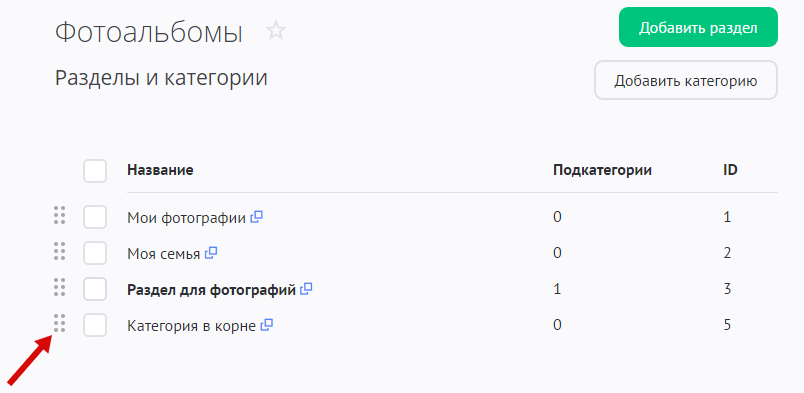 Перейдите на страницу «Модули» / «Фотоальбомы» / «Категории». В списке категорий потяните за иконку и переместите раздел или категорию вверх/вниз: