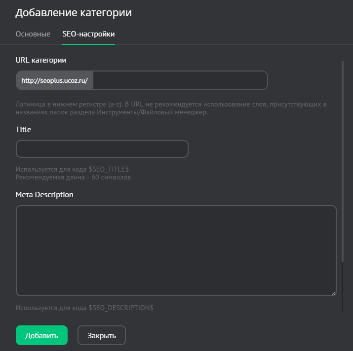 - SEO-настройки. Доступны после оплаты любого тарифа, кроме «Базовый», и включения «Уникальные Title, Description, Keywords» в SEO-модуле.