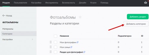 На странице «Модули» / «Фотоальбомы» / «Категории» нажмите на кнопку «Добавить категорию»: