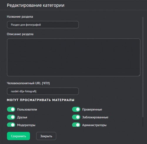 Важно! Добавление изображений в фотоальбом невозможно при отсутствии категорий. Поэтому для публикации материалов недостаточно одних разделов.