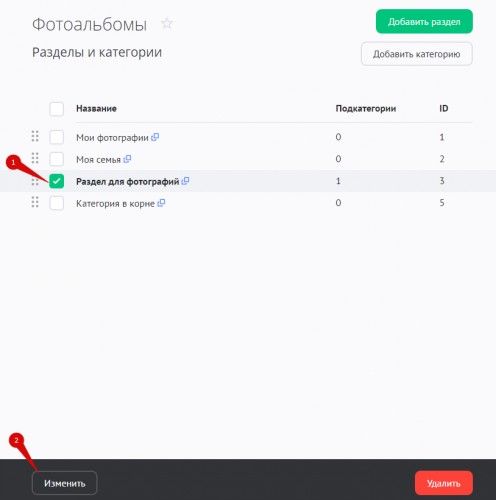 На странице «Модули» / «Фотоальбомы» / «Категории» отметьте категорию или раздел, который хотите изменить, и нажмите на кнопку «Изменить»: