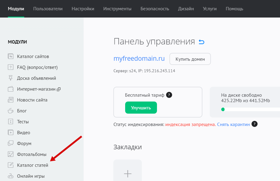 В панели управления сайтом выберите модуль «Каталог статей» из списка: