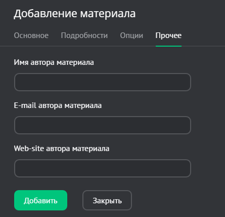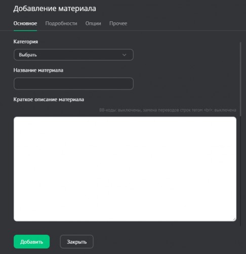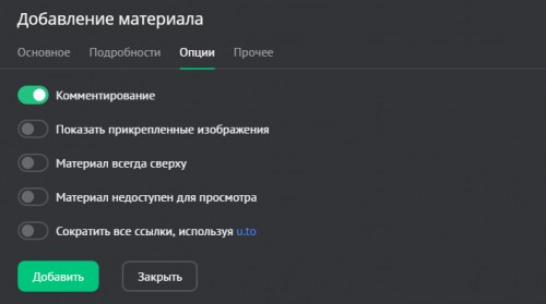 - Материал недоступен для просмотра (премодерация). Включает/отключает возможность просмотра материала пользователями. При включении данной опции материал после добавления неактивен (скрыт).