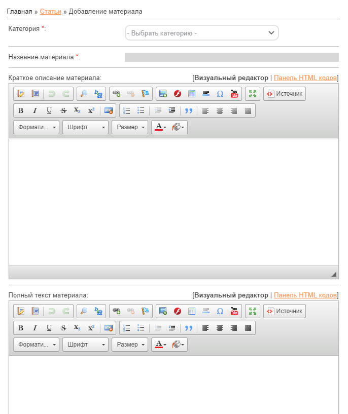 Добавление статьи через панель управления