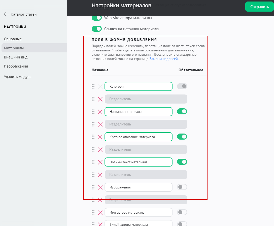 Чтобы изменить порядок и состав полей при добавлении статьи, зайдите в настройки модуля «Каталог статей» и в разделе «Материалы» / «Поля в форме добавления» добейтесь желаемого результата: