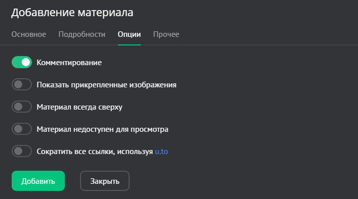 - Сократить все ссылки, используя u.to или Проксировать все внешние ссылки в материале. Опции доступны в зависимости от выбранных настроек сайта в разделе «Настройки» / «Системные».
