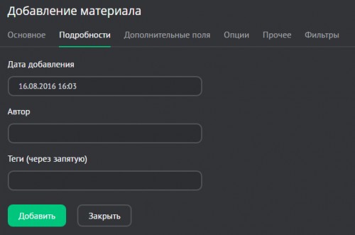 - Дата добавления. Датой добавления материала (в том числе неактивного) считается дата его создания. Чтобы изменять это вручную, включите опцию «Выбирать дату добавления материала» в настройках модуля.