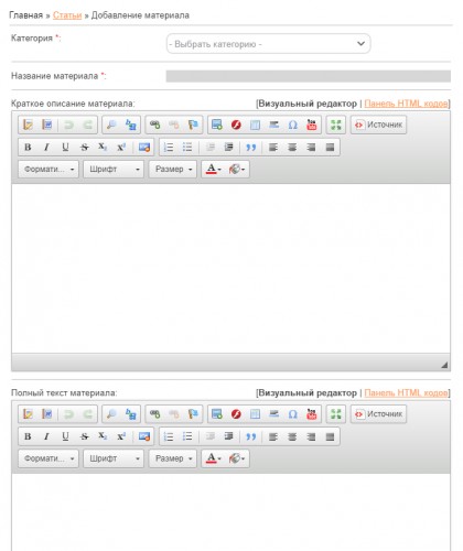 - Категория. Указывается категория для материала. Это поле является обязательным для заполнения. Материал может относиться одновременно к нескольким категориям. Данная возможность активируется в настройках модуля опцией «Вхождение материала сразу в несколько категорий».