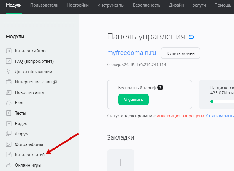 Чтобы подключить модуль, войдите в панель управления сайтом. На главной странице панели в левой колонке «МОДУЛИ» нажмите на изображение «+»: