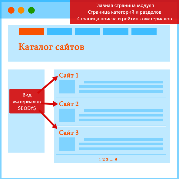 За вывод материалов отвечает переменная $BODY$. Как и на главной странице, $PAGE_SELECTOR$ покажет переключатель страниц.