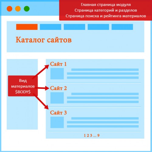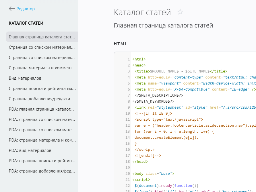 Шаблон «Вид материалов» отвечает за показ анонсов добавленных статей. Все добавленные на сайт статьи в соответствии с заданным в шаблоне видом помещаются в переменную $BODY$, которая используется в шаблонах: