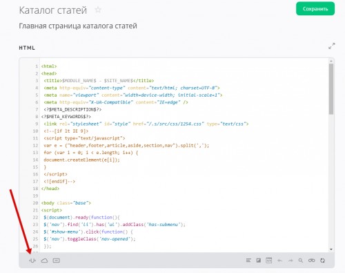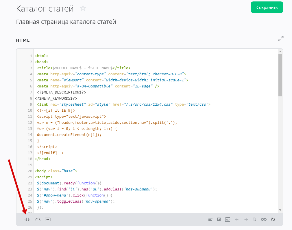 В каждом из шаблонов модуля используется свой набор переменных. Они могут выполнять разные функции и выводить различную информацию. При работе с шаблоном вы можете в любой момент посмотреть список действующих переменных, нажав на значок в редакторе:
