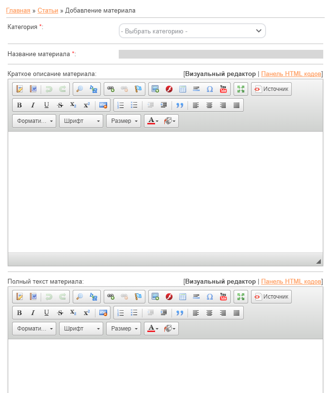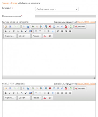 - Страница добавления/редактирования материала