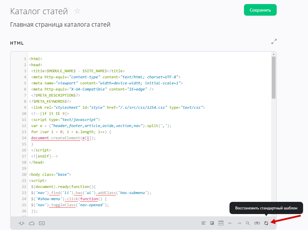 Если в процессе правки одного из шаблонов вы захотите отменить внесенные изменения, воспользуйтесь кнопкой «Восстановить стандартный шаблон»: