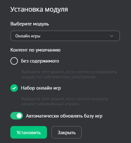 Выберите модуль «Онлайн-игры» и опцию «Контент по умолчанию»: