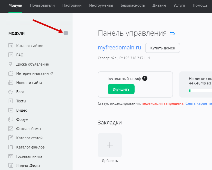Чтобы подключить модуль, войдите в панель управления сайтом. На главной странице панели в левой колонке «МОДУЛИ» нажмите на изображение «+»: