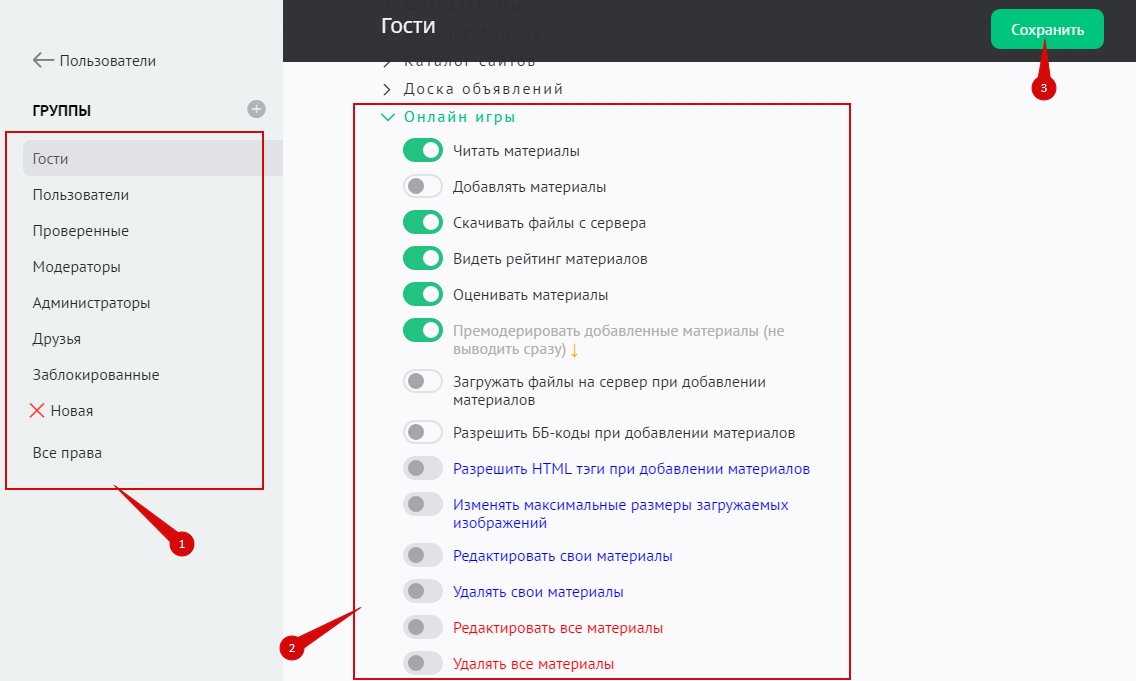 В модуле «Онлайн-игры» предусматривается настройка прав групп пользователей при работе с категориями и разделами. Каждая категория или раздел настраивается индивидуально при создании.