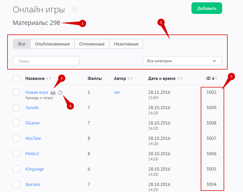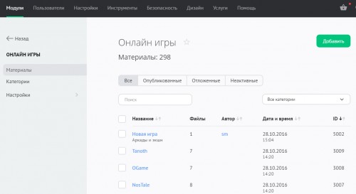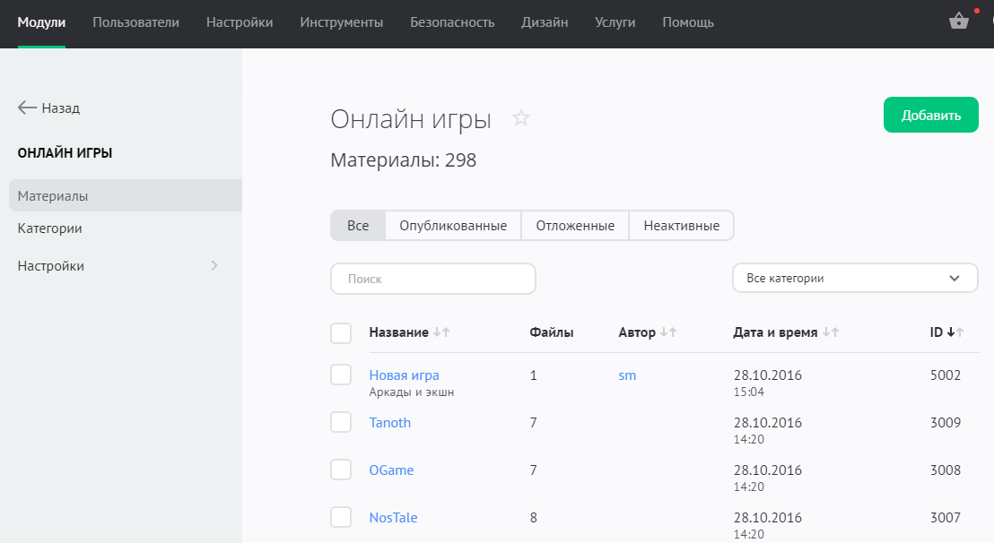 Управление добавленными играми выполняется в разделе «Модули» / «Онлайн-игры» / «Материалы»: