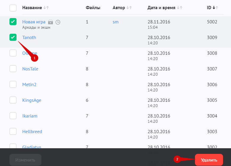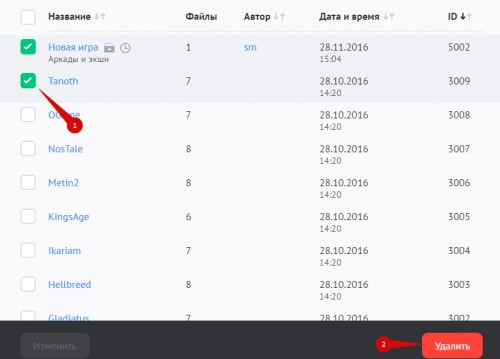 Чтобы удалить одну или несколько игр, отметьте их в списке и нажмите на кнопку «Удалить»: