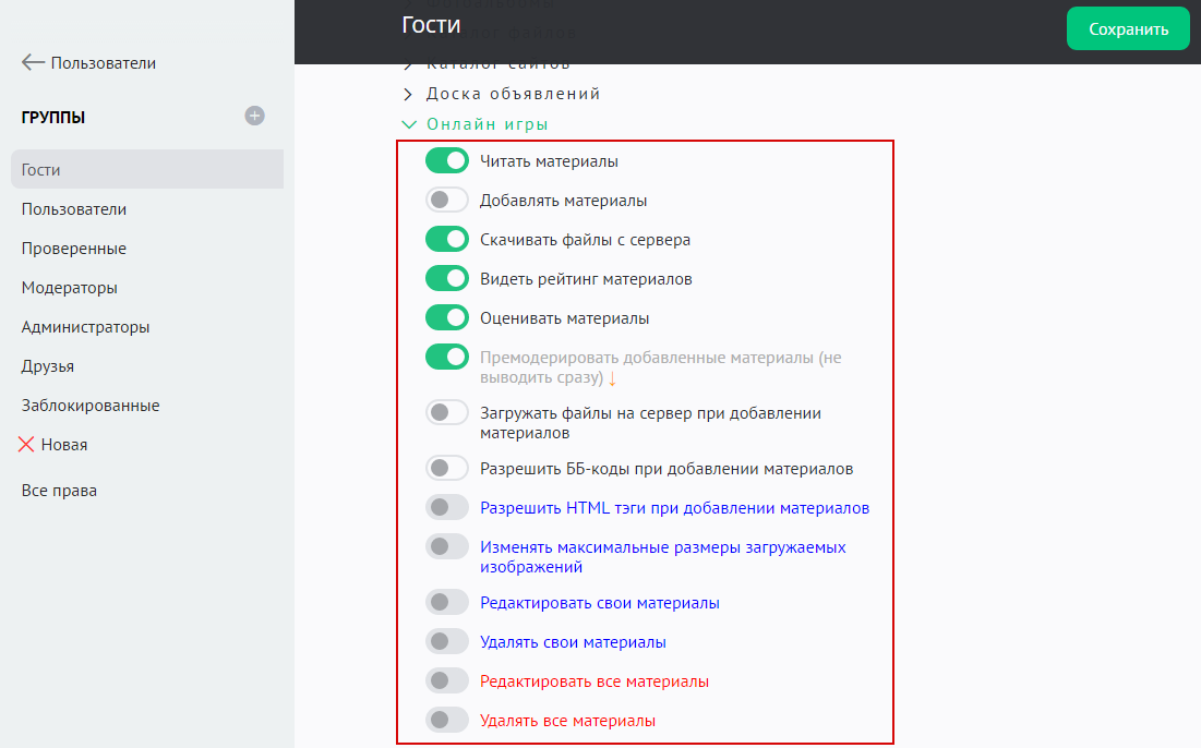 Все кнопки на панели модератора присутствуют в соответствии с правами групп пользователей. Их можно изменить в разделе «Пользователи» / «Группы»: