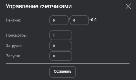 - Управление счетчиками. Позволяет задать количество просмотров и рейтинг игры. Все последующие просмотры и оценки будут прибавляться к заданным.