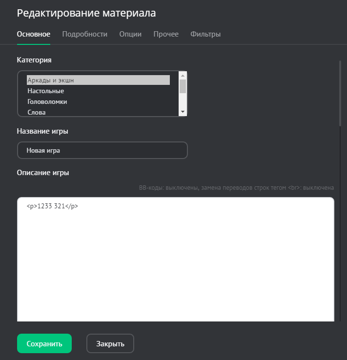 Измените данные, которые прикреплены к игре, и нажмите на кнопку «Сохранить». Чтобы узнать больше о полях, которые могут быть прикреплены к игре, читайте инструкцию о добавлении игры.