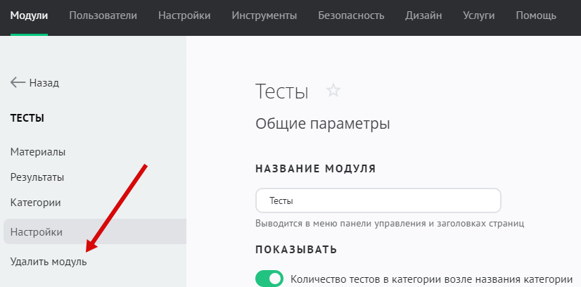 На главной странице панели управления сайтом перейдите в модуль «Тесты». В меню слева выберите пункт «Удалить модуль»: