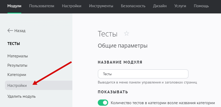 Чтобы приступить к настройкам модуля, в панели управления выберите раздел «Тесты» и в меню слева нажмите на пункт «Настройки»: