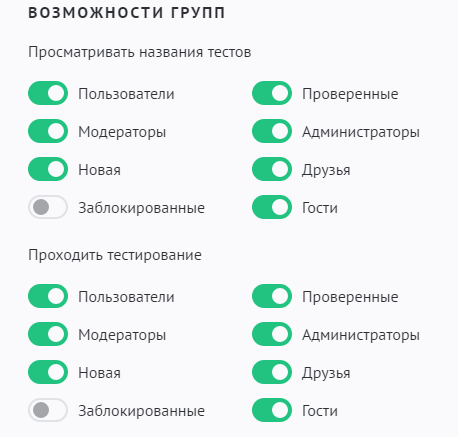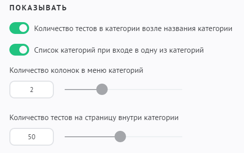 - Количество тестов на страницу внутри категории. Настройка регулирует показ анонсов тестов на страницах категорий. Тесты, которые не вошли в указанное количество, можно просматривать с помощью переключателя страниц.