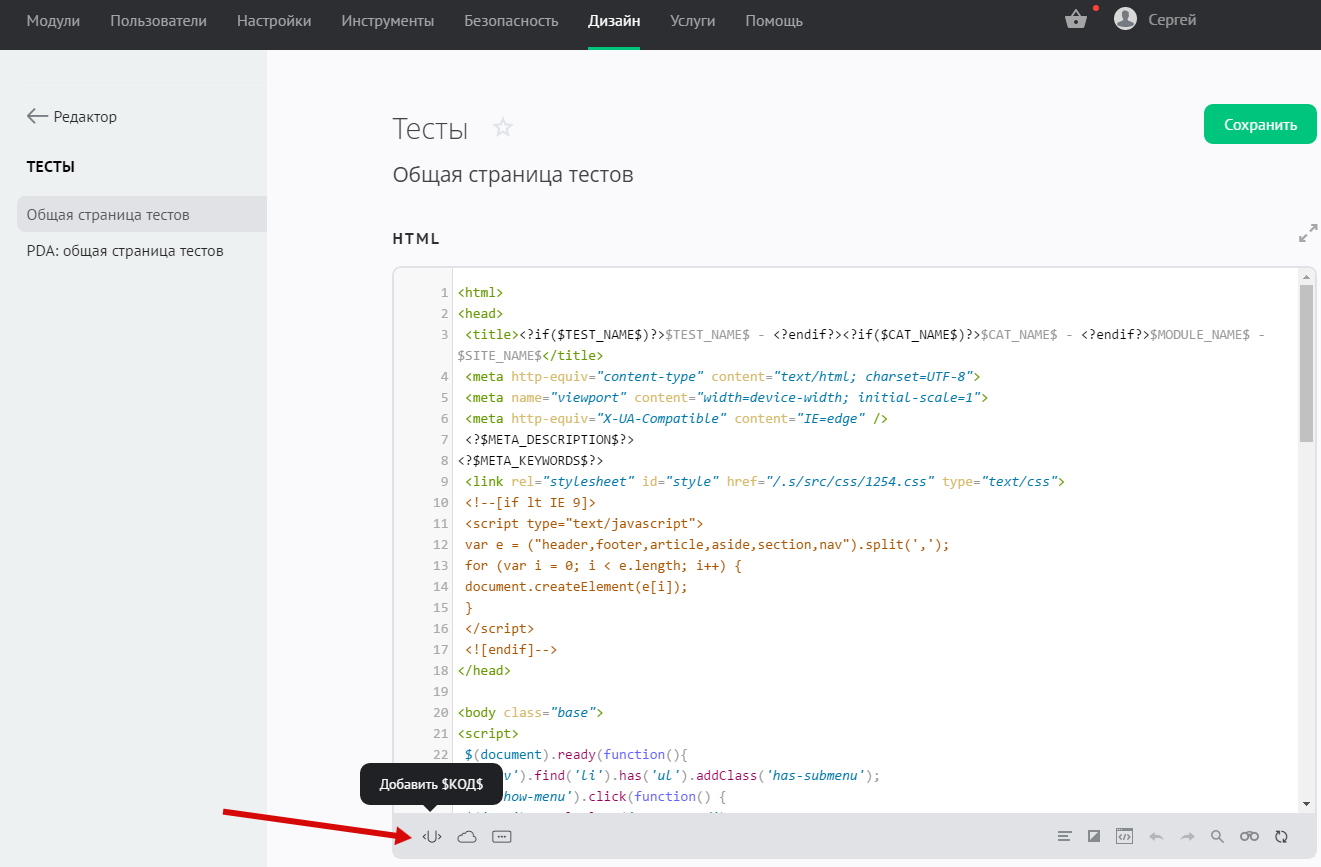 При работе с шаблоном вы можете в любой момент посмотреть список действующих переменных, нажав на значок в редакторе: