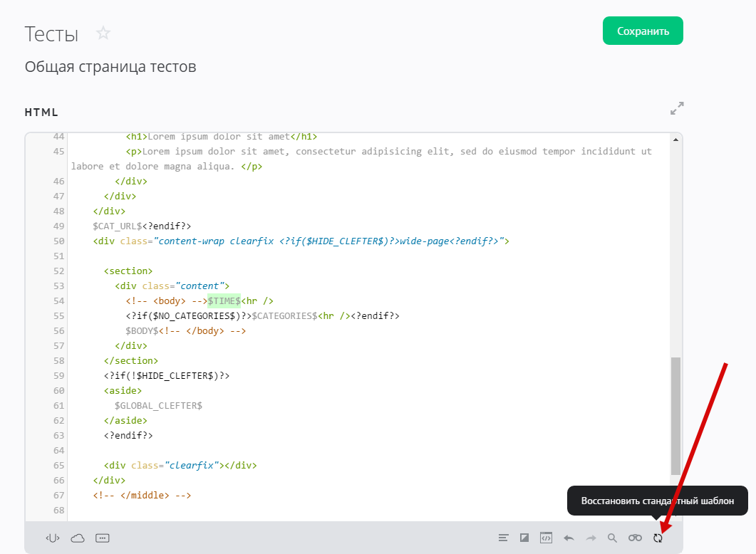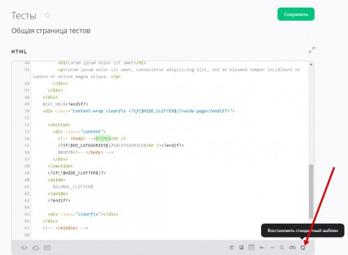 Если в процессе правки шаблона вы захотите отменить внесенные изменения, воспользуйтесь кнопкой «Восстановить стандартный шаблон»: