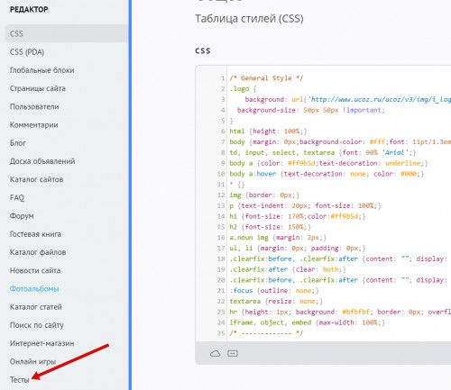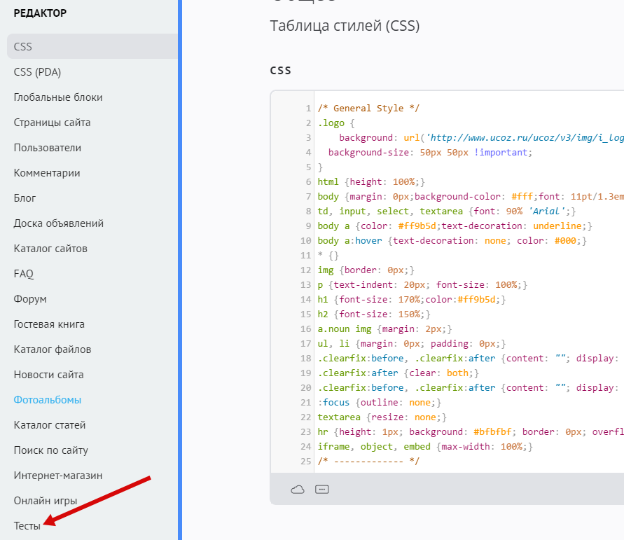 В списке модулей слева выберите «Тесты»: