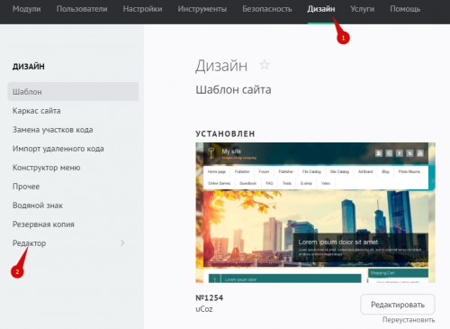 Чтобы приступить к редактированию шаблона, в панели управления сайтом перейдите в «Дизайн» / «Редактор»: