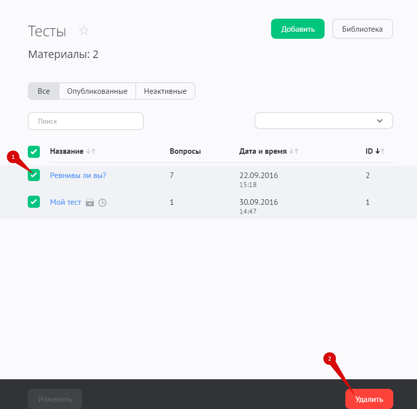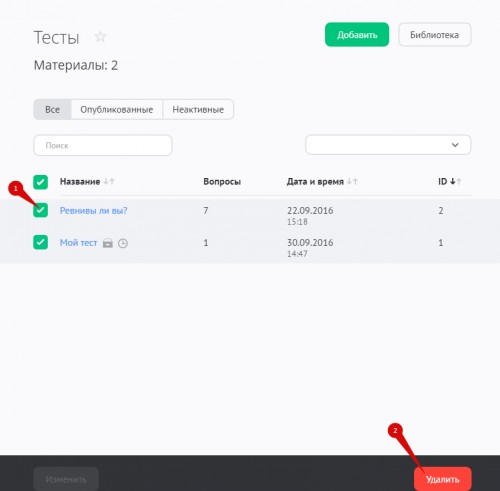 Чтобы удалить один или несколько тестов, отметьте их в списке и нажмите на кнопку «Удалить»: