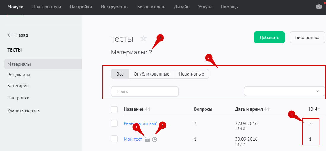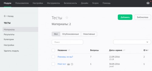 Управление добавленными на сайт тестами выполняется в разделе «Модули» / «Тесты» / «Материалы»: