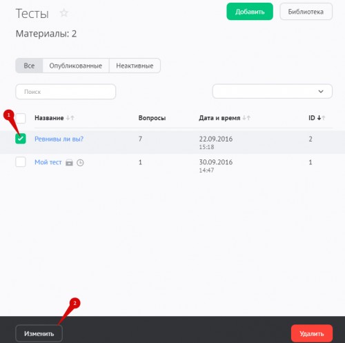 Для редактирования теста отметьте его и нажмите на кнопку «Изменить»: