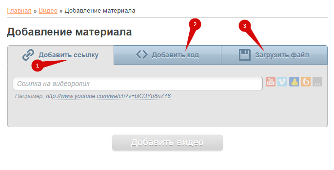 Все три способа актуальны при добавлении ролика через панель инструментов или с главной страницы модуля. В панели управления видео добавляется по ссылке или коду.