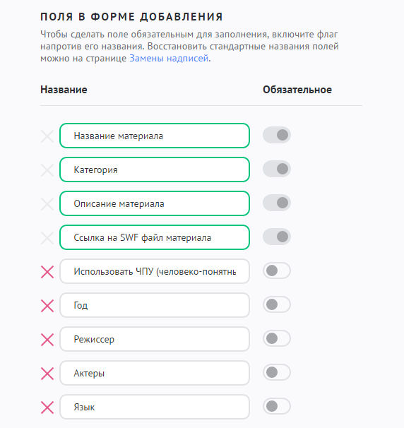 Чтобы изменить состав полей при добавлении видео, зайдите в настройки модуля «Видео» и в разделе «Материалы» добейтесь желаемого результата: