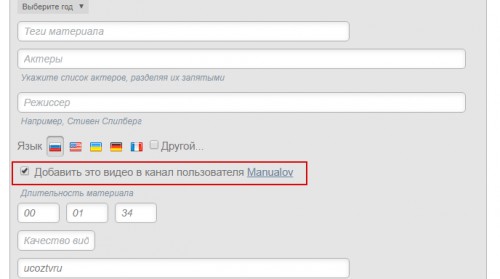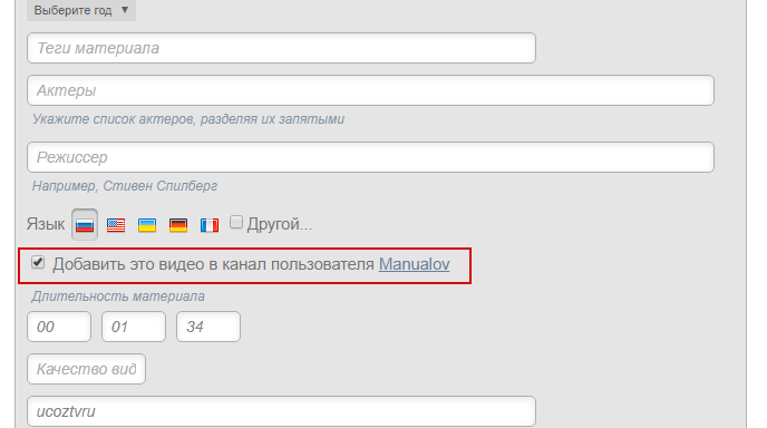 Полученный код пропишите в поле «Код для вставки видео» и заполните остальные поля.
