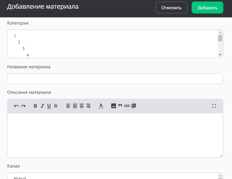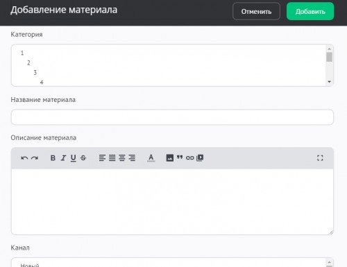 - Категория. В зависимости от выбранного набора предустановленных категорий указывается категория для материала. Категория является обязательным для заполнения полем. Материал может относиться одновременно к нескольким категориям. Данная возможность активируется в настройках модуля опцией «Вхождение материала сразу в несколько категорий».