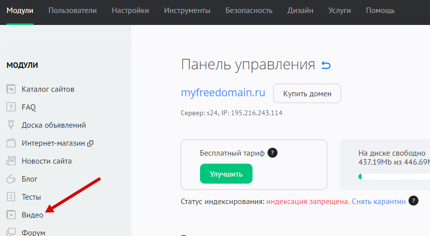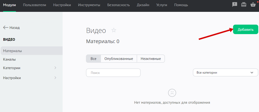 В панели управления сайтом выберите модуль «Видео» из списка: