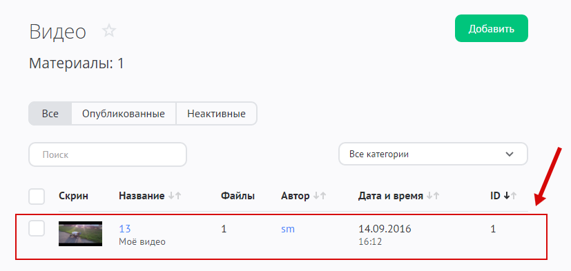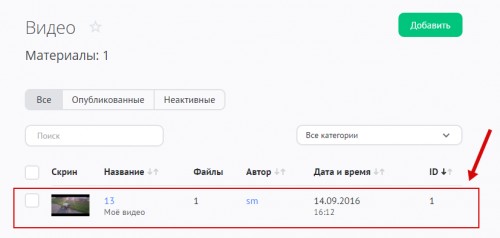 Когда закончите заполнять все поля материала, нажмите на кнопку «Добавить», и видео появится в списке: