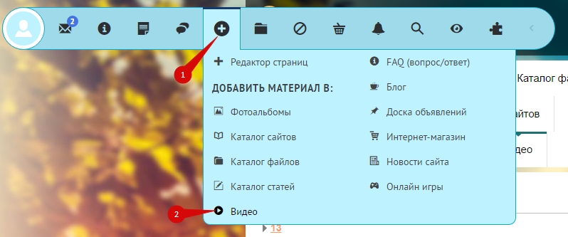 Панель инструментов содержит раздел, который позволяет быстро переходить к добавлению видеоматериалов на сайт. Нажмите на иконку «+» и выберите модуль, в который хотите добавить материал: