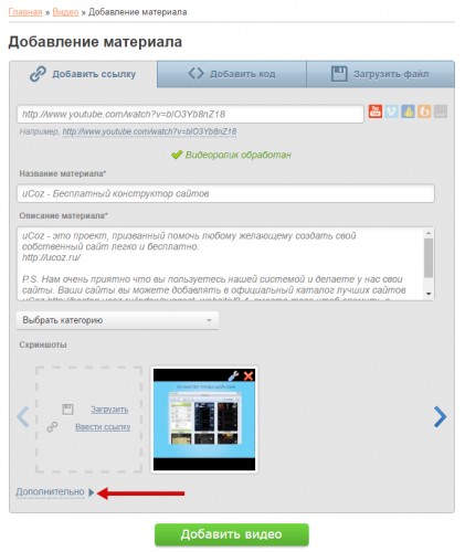 Выберите способ добавления видео (способы мы рассматривали ранее). Для внесения данных о видео нажмите на ссылку «Дополнительно»: